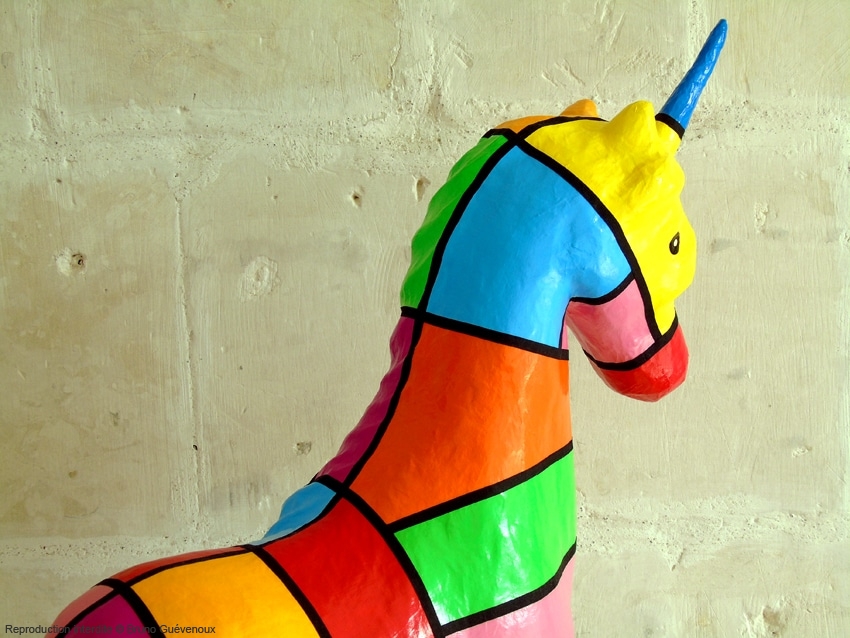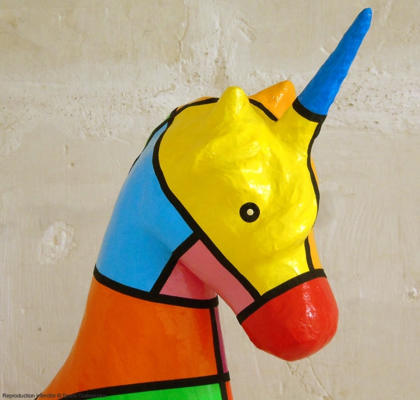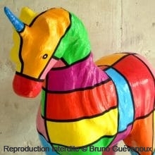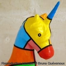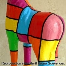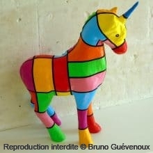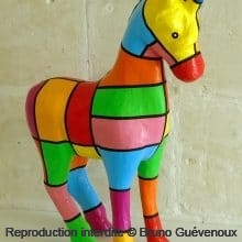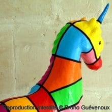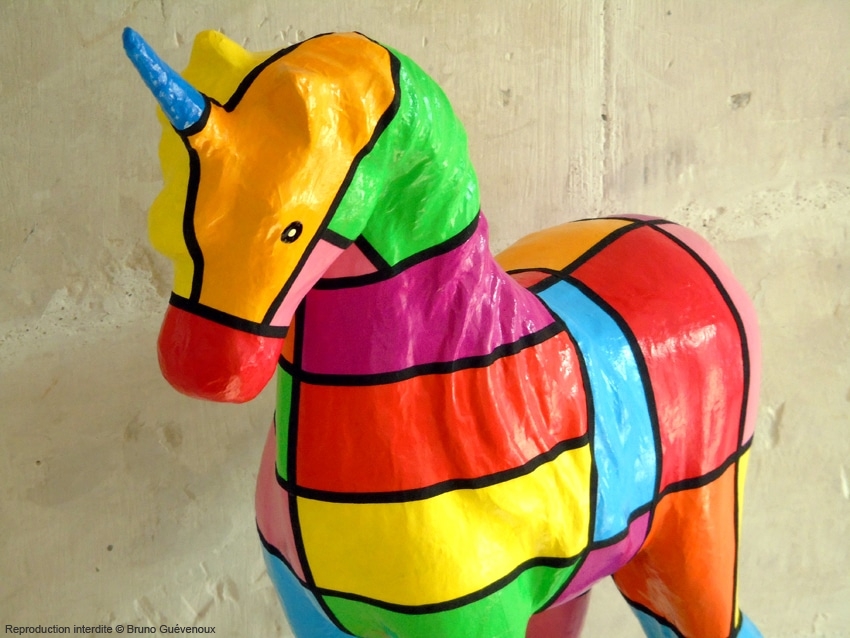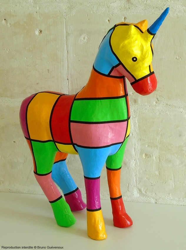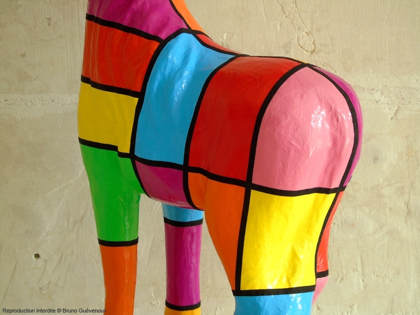 Support : Sculpture papier mâché. Carton et papier encollés et modelés sur plusieurs couches. Zones de couleurs délimitées par une bande noire thermo collée. Support peint puis recouvert d’un vernis et d’un laquage.