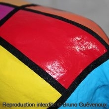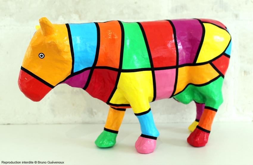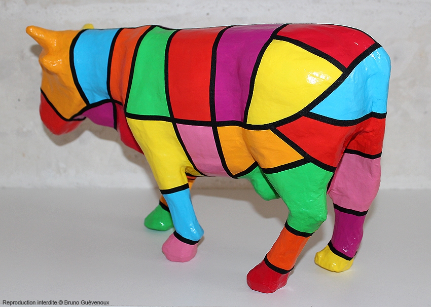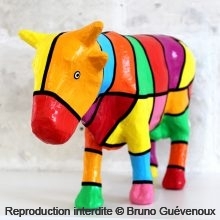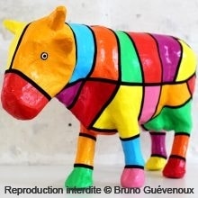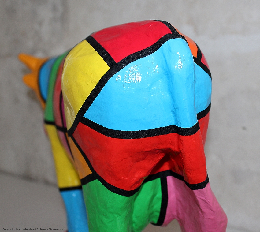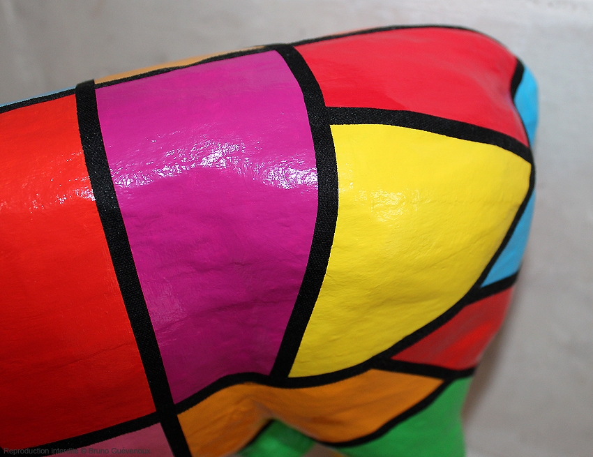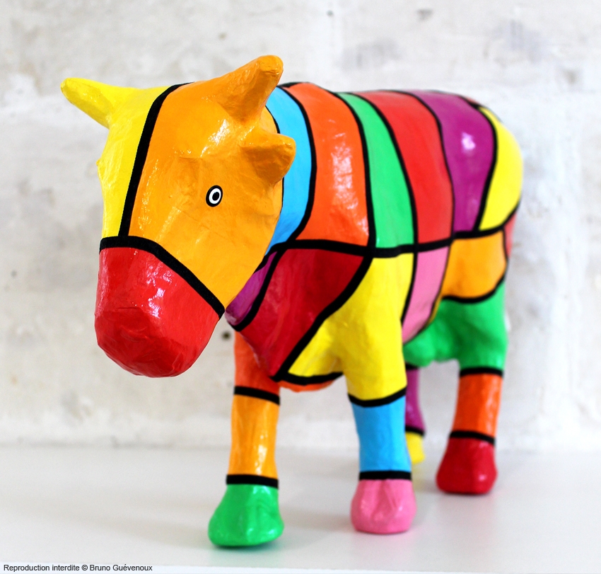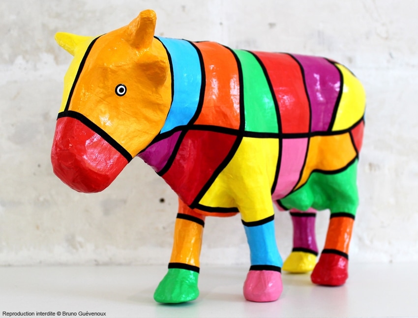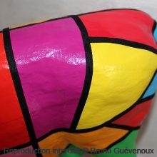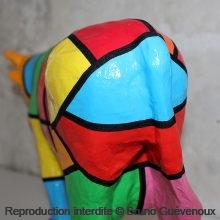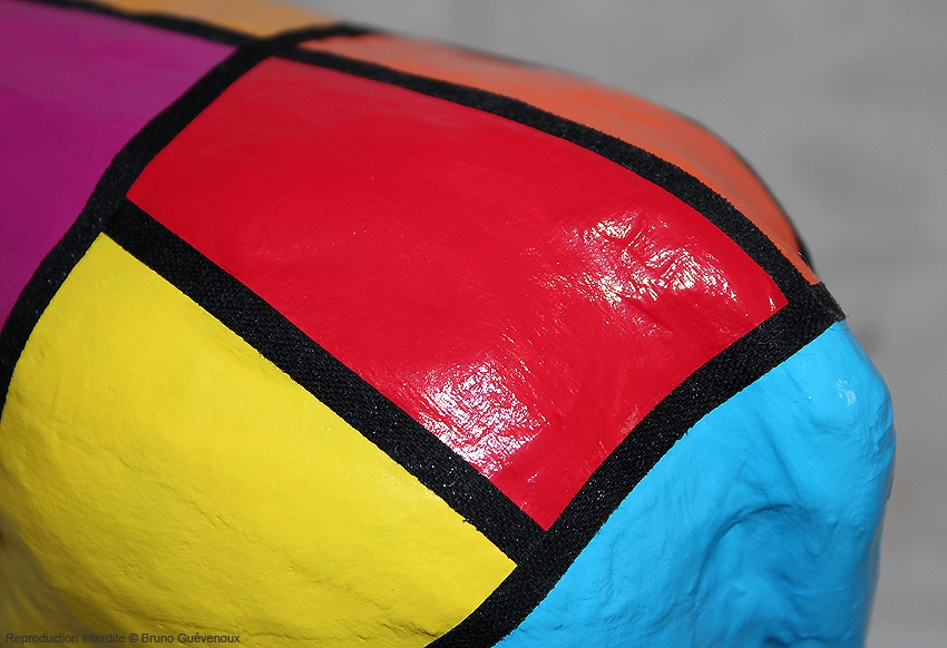 Support : Sculpture papier mâché. Carton et papier encollés et modelés sur plusieurs couches. Zones de couleurs délimitées par une bande noire thermo collée. Support peint puis recouvert d’un vernis et d’un laquage.