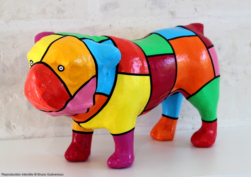 Support : Sculpture papier mâché. Carton et papier encollés et modelés sur plusieurs couches. Zones de couleurs délimitées par une bande noire thermo collée. Support peint puis recouvert d’un vernis et d’un laquage.