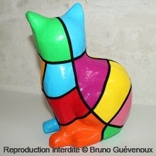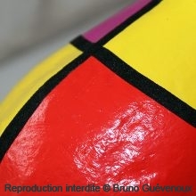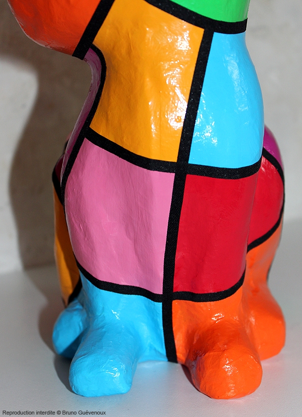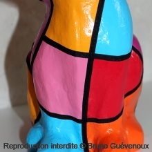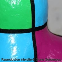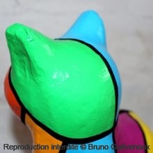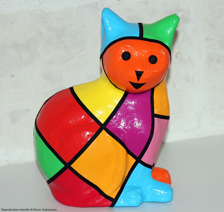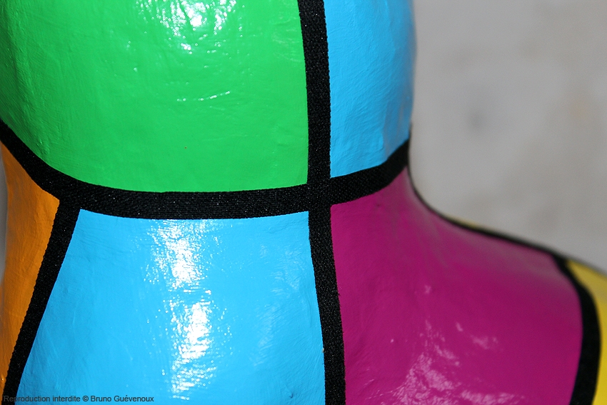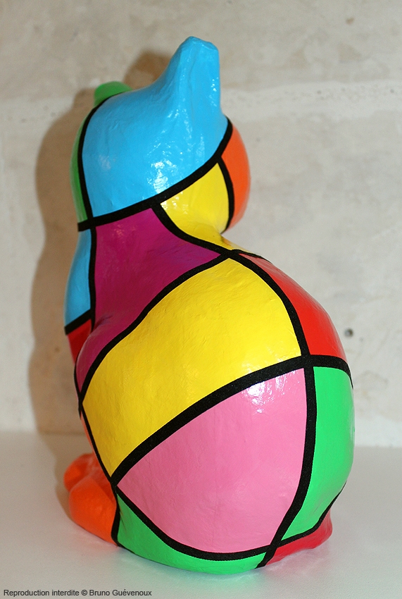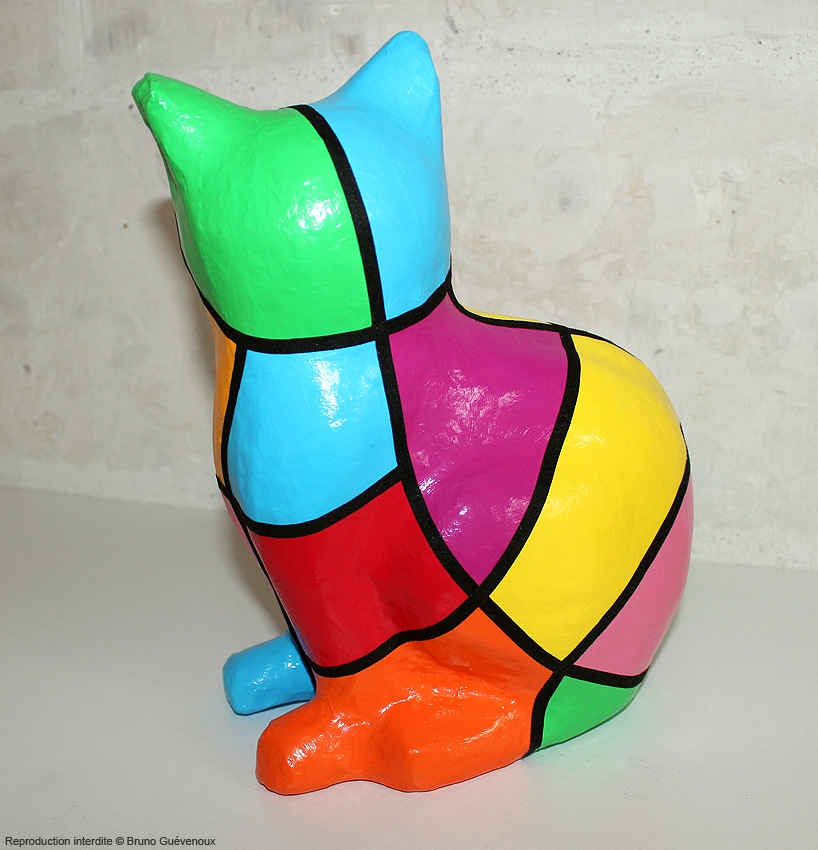 Support : Sculpture papier mâché. Carton et papier encollés et modelés sur plusieurs couches. Zones de couleurs délimitées par une bande noire thermo collée. Support peint puis recouvert d’un vernis et d’un laquage.