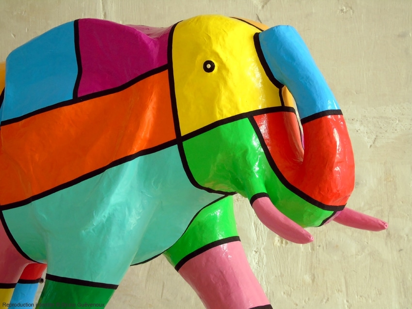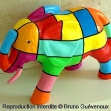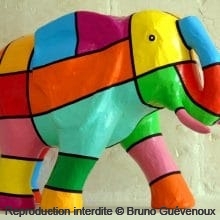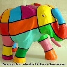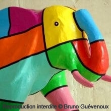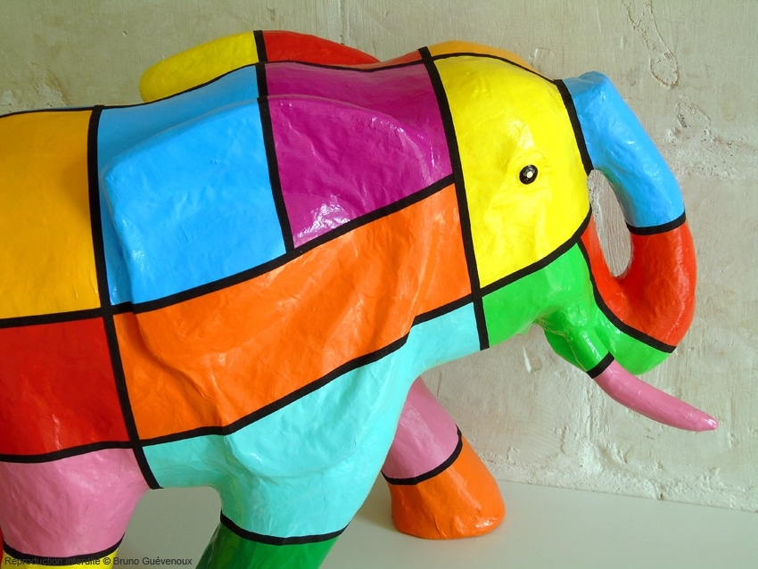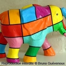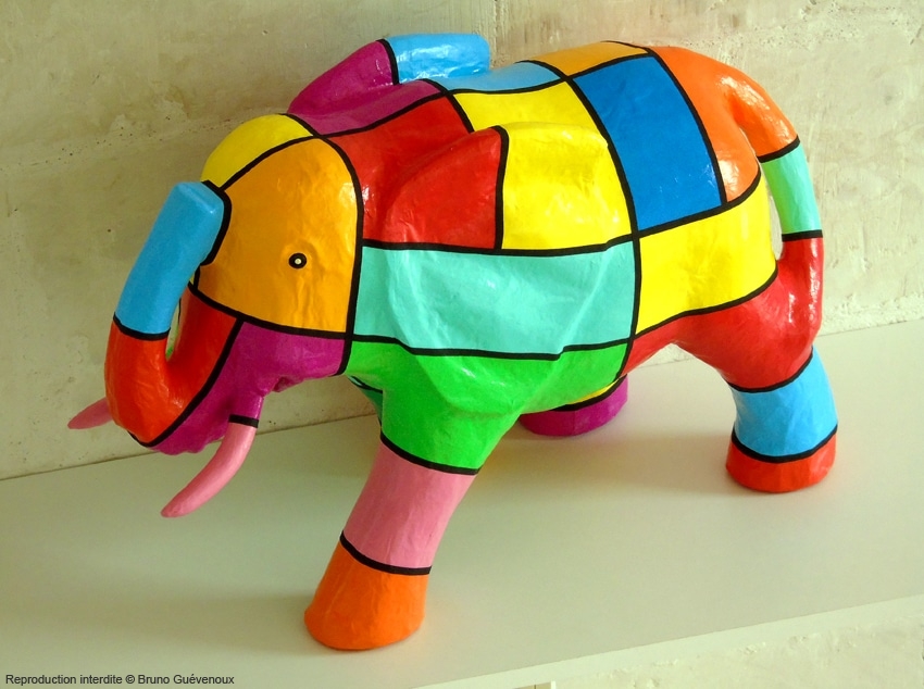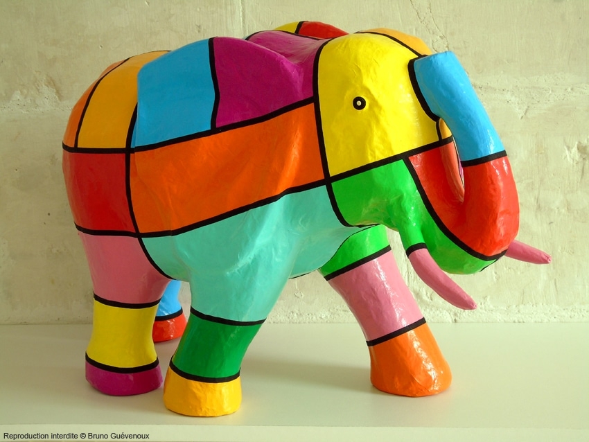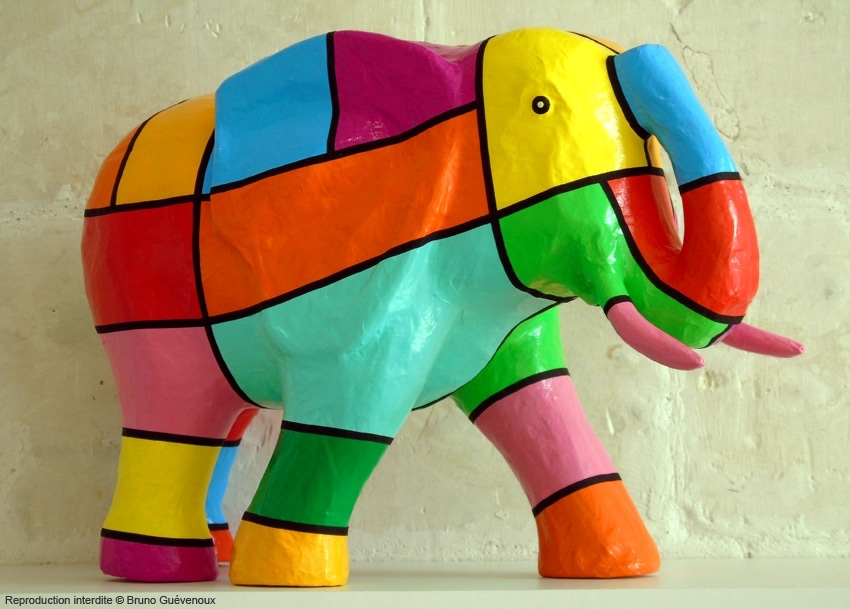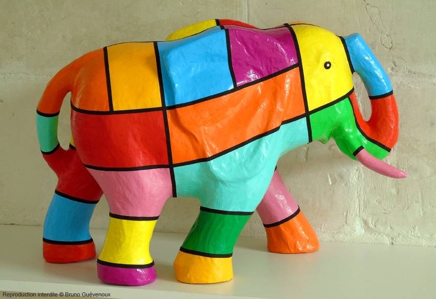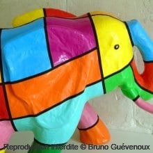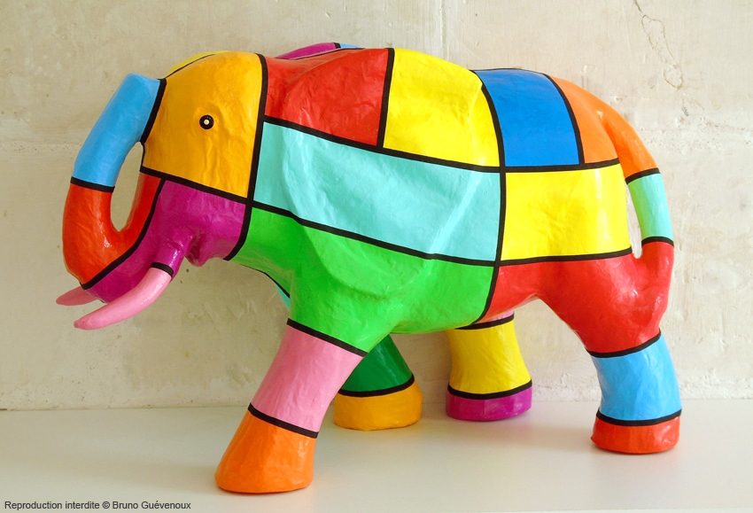 Support : Sculpture papier mâché. Carton et papier encollés et modelés sur plusieurs couches. Zones de couleurs délimitées par une bande noire thermo collée. Support peint puis recouvert d’un vernis et d’un laquage.