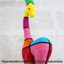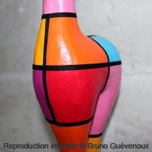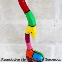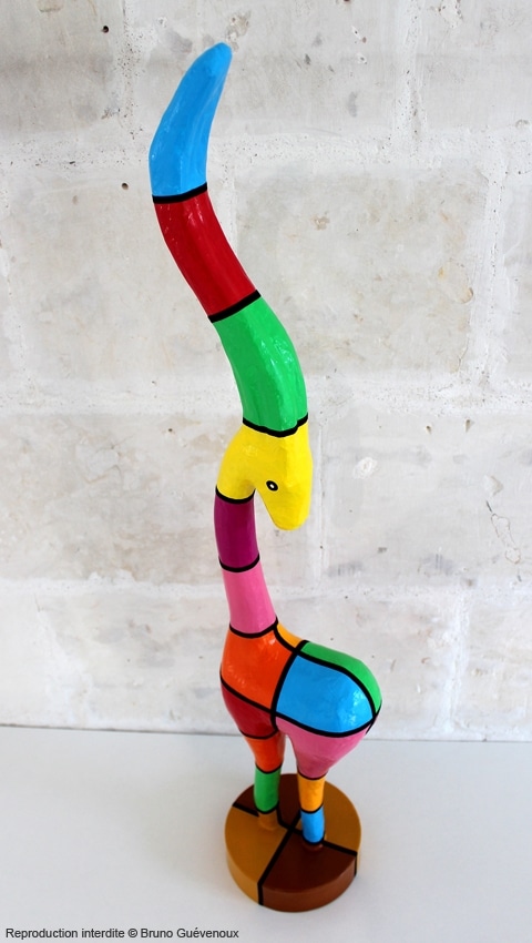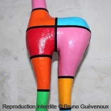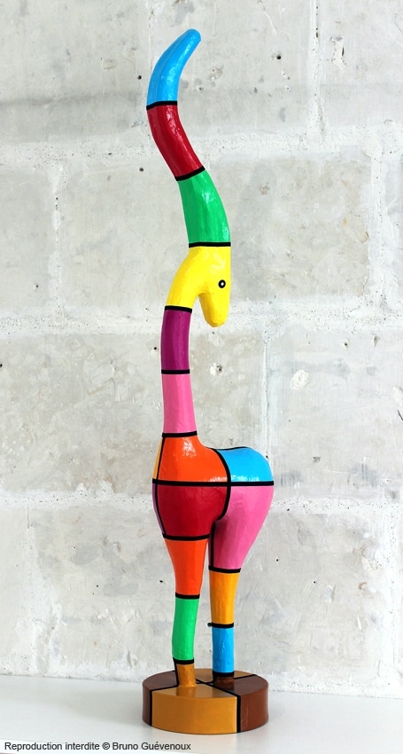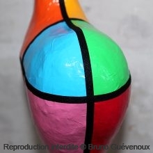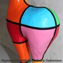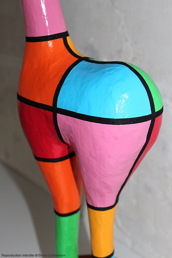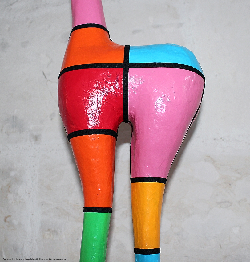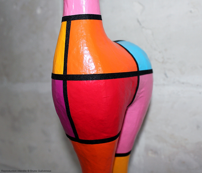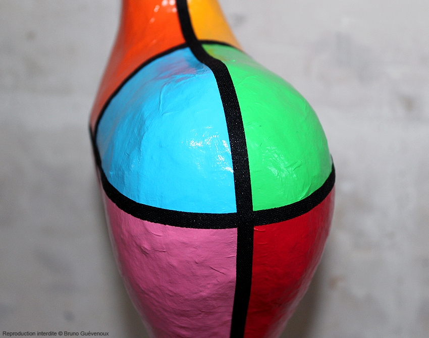 Support : Sculpture papier mâché. Carton et papier encollés et modelés sur plusieurs couches. Zones de couleurs délimitées par une bande noire thermo collée. Support peint puis recouvert d’un vernis et d’un laquage.